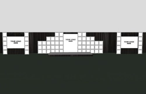 Make your event memorable and distinctive with our customizable stage setup—a central branded wall w/ 2 tin walls. Tailored solutions for your perfect stage.