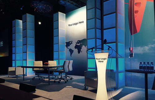 Elevate your event with our customizable stage setup—2 offset nantucket walls with branded wall and podium. Tailored solutions for your perfect stage.