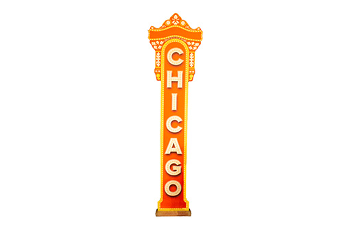 Learn more about how the elite creatives at the Ampa design team can help you build your event from the ground up with event rental offerings including a vast drape selection, many lighting options and designs, theme decor to match any theme, and a multitude of furniture including specialized designer seating groups as seen here! This large sign is a bright color and features the word “Chicago” on it! This will be sure to bring a pop of color to your next event.