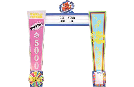 No need to play a game of chance with us. This entranceway is guaranteed to empress with its bold colors, game show additions, and changeable marquee header. It is a great focal point for any game show, casino night, or themed event.