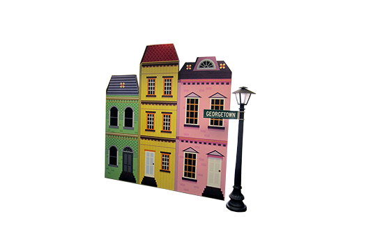 This neighborhood set features three buildings that have a bright color. This set is perfect for stage sets, photo ops, or just as decoration. These brightly colored houses will add a pop of color to any events. These Three Row Buildings are in distinct styles such as Brick and Brown Stone with a Neighborhood Sign.
